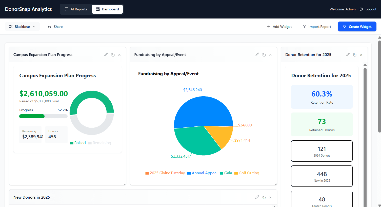 DonorSnap Analytics is an AI-powered reporting add-on that answers your fundraising questions with instant reports. Now you can easily answer board questions on the spot, identify upgrade prospects in seconds, and track retention trends with confidence. All while your donor data stays completely private.