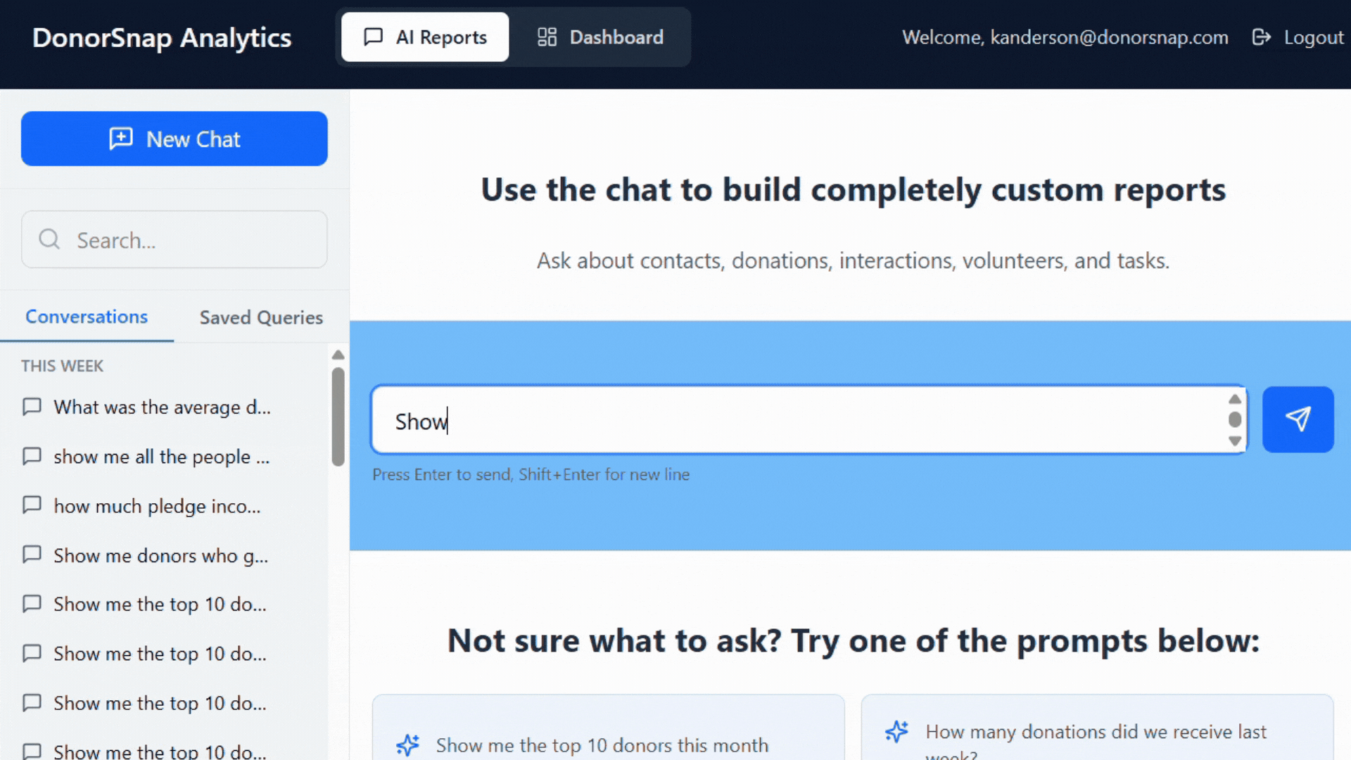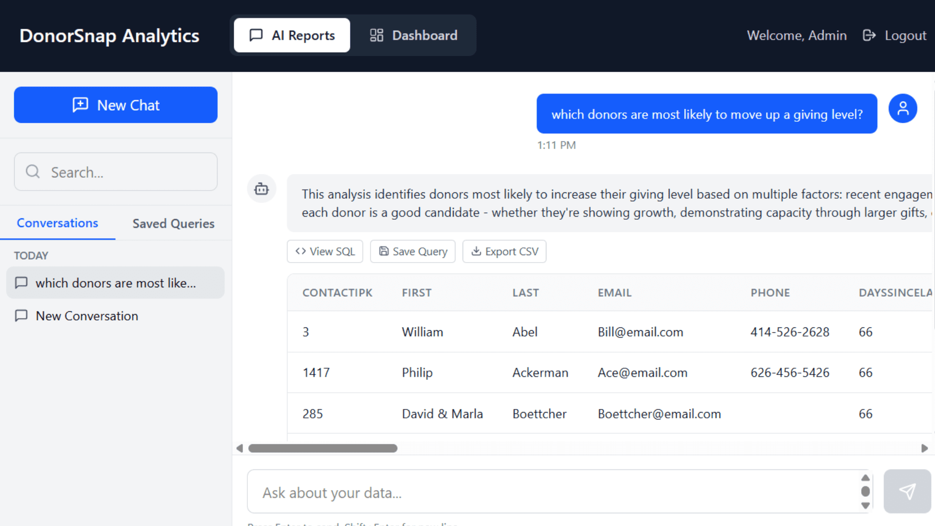 Build custom reports through a chat interface. Describe what you want to see in plain English, and DonorSnap Analytics creates the report for you. Export results to CSV or save queries to run again later.