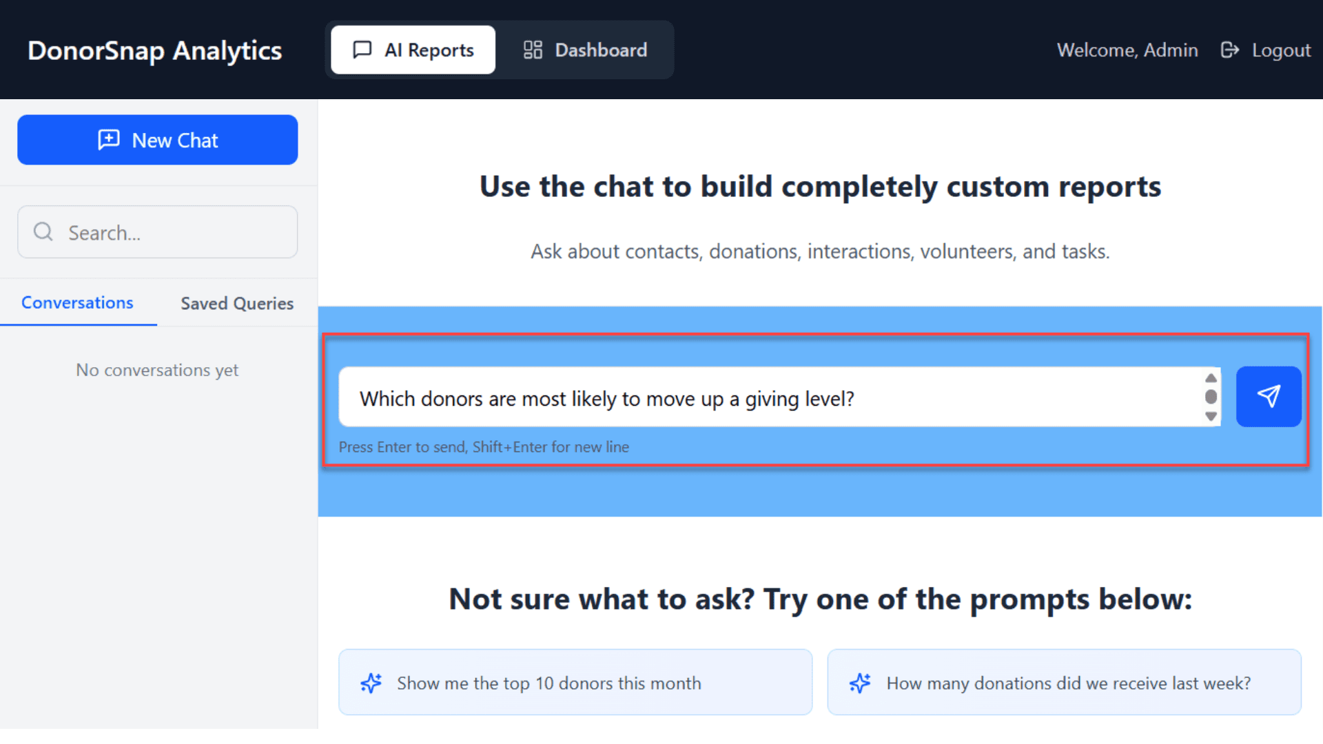 DonorSnap’s reporting tools are still available and work great for scheduled reports and standard analysis. DonorSnap Analytics adds a conversational layer that lets you ask ad-hoc questions and get instant answers without building queries. Think of it as having both a comprehensive reporting suite AND a data analyst available 24/7.